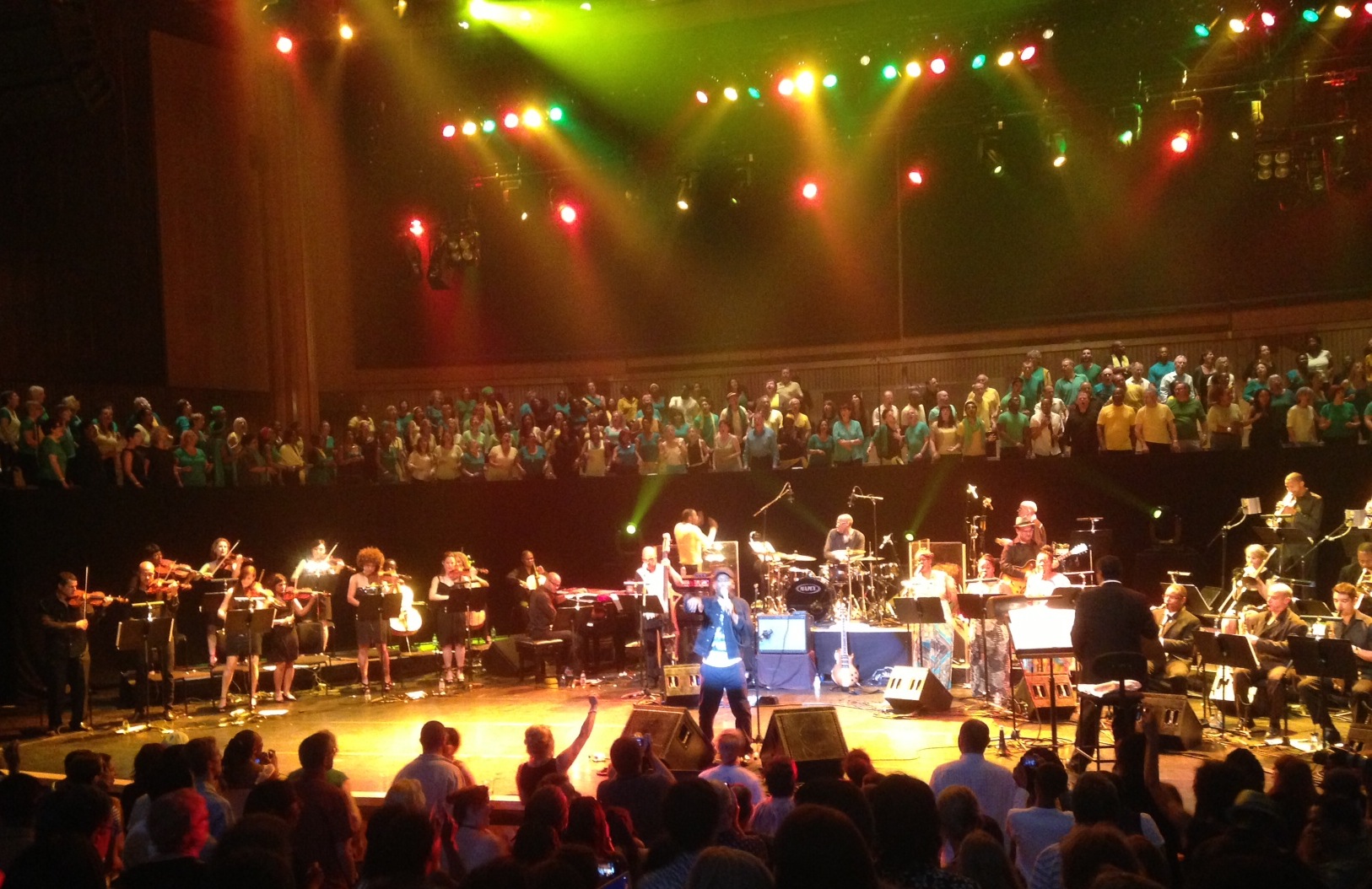 That’s a long way of getting round to talking about last night’s gig at the Festival Hall, but it might help to explain why I found it so moving when the 21-member Jazz Jamaica All Stars, the 12-piece Urban Soul string ensemble, the 240-person Voicelab choir, the conductor Kevin Robinson, the choirmaster Mark De Lisser and the singer-guitarist Brinsley Forde launched into “No More Trouble”. In that moment, in that song’s combination of baleful cadences and stare-down optimism, the summoning of musical and spiritual powers was at its most intense: spine-tingling at the start, overwhelming by the finish.