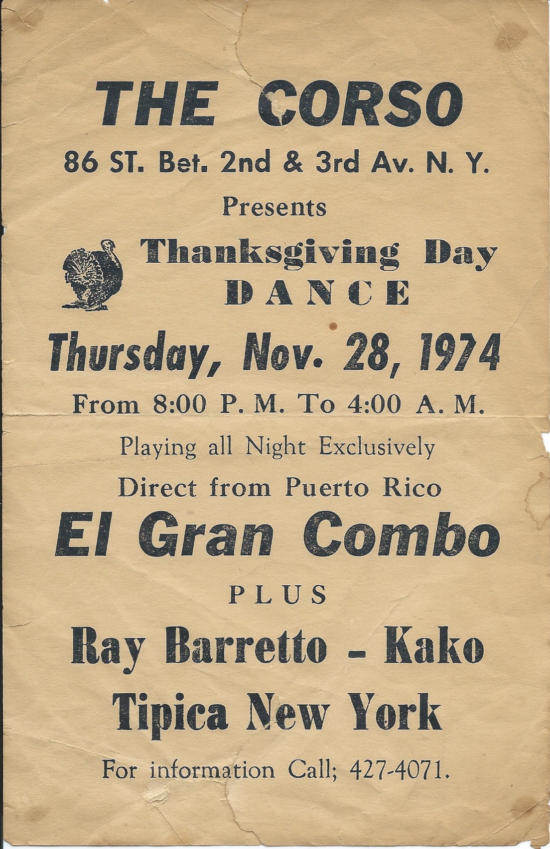 This gives me an excuse to write about the first time I saw Barretto in person, at a club called the Corso at 205 East 86th Street, off the corner of 3rd Avenue, half a dozen blocks below East Harlem, also known as Spanish Harlem, or El Barrio. From 1970 to 1985, a period encompassing the start and the flowering of the salsa era, the Corso was perhaps New York’s principal rendezvous for lovers of Latin music, as the Palladium had been in the 1960s. Its owner, a restaurateur and club owner named Tony Raimone, had bought it in 1968 and was soon persuaded by Pete Bonet, one of Barretto’s singers (and one of the voices on “El Watusi”), to institute a musical policy appealing to the city’s Cuban and Puerto Rican expatriates.