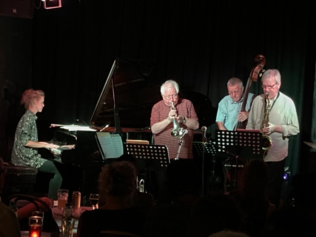 The Vortex on Saturday night, with its reduced socially-distanced attendance, wasn’t exactly Woodstock, but Still Waters — Pete Hurt on tenor, Dave Green on bass, Paul Clarvis on drums and Alcyona Mick depping for the regular pianist, Barry Green — produced a set of lovely music. Henry’s compositions are like his improvising, characterised by an innate lyricism, and I particularly enjoyed the chance to hear a live performance of “Can’t Believe, Won’t Believe”, the beguiling title track from his most recent album. Throughout the set the trumpet solos had that typical blend of beautiful tone, song-like phrases and surprising twists. The piano solos also caught the ear, Mick deploying a variety of resources, from silvery single-note lines to beautifully formed chordal inventions, as she took every chance to add a sense of elegant drama.