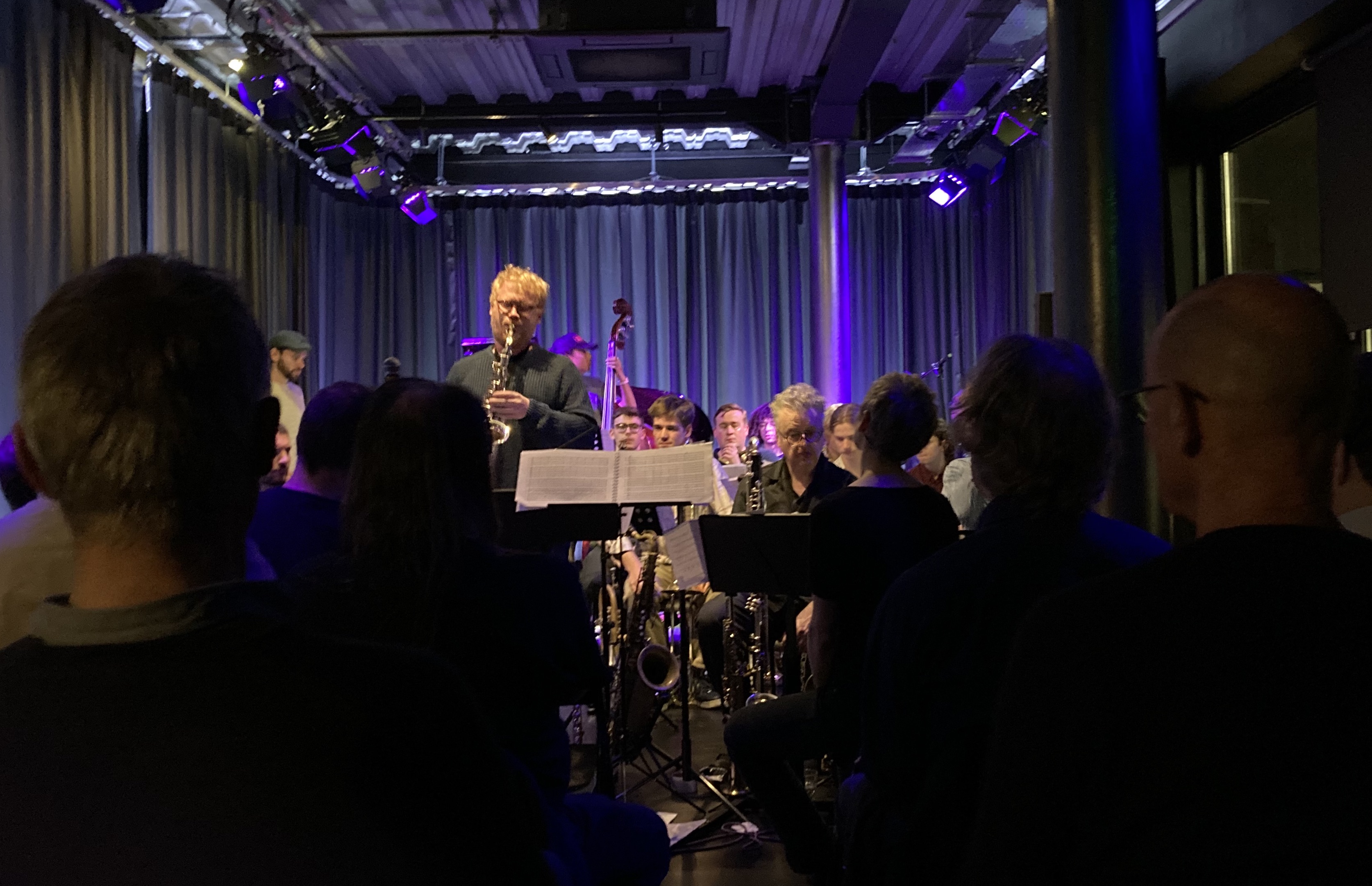 I went to the first house last night and thoroughly glad I did. I couldn’t help making some mental comparisons with Mike Westbrook, who is just a year older and whose big band version of Rossini I saw in Cambridge a few weeks ago. Although neither, understandably, actively leads the band these days, this only serves to draw attention to the strength of the arrangements and the enormous legacy of both men. And both Mikes seemed to really enjoy the respective occasions.