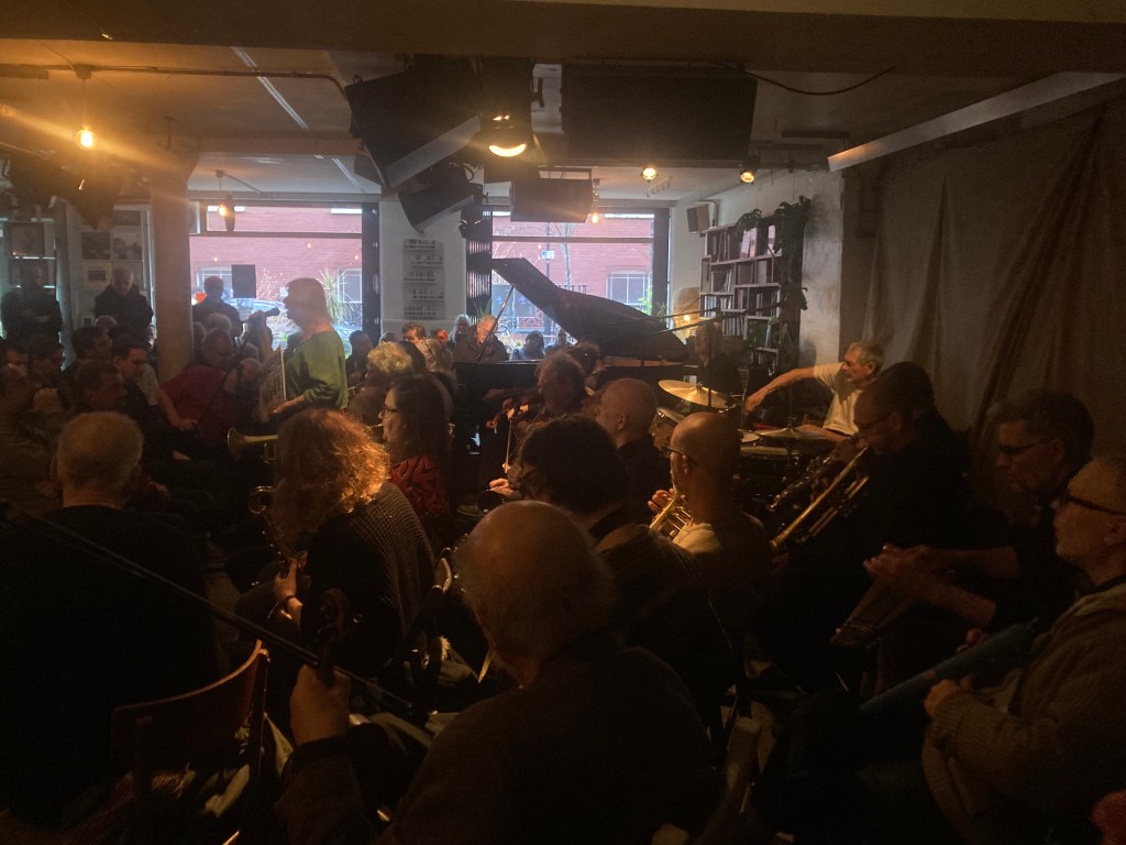Today at Café Oto and the Vortex many of those artists performed in celebration and commemoration of Martin’s life. It was my privilege to introduce the Café Oto gig, which began with a set from the quartet pictured above during their soundcheck — Parker, Mark Sanders, Hannah Marshall and Matt Wright — and continued with the duo of the altoist Caroline Kraabel and the pianist Veryan Weston before concluding with the 27-strong London Improvisers Orchestra.