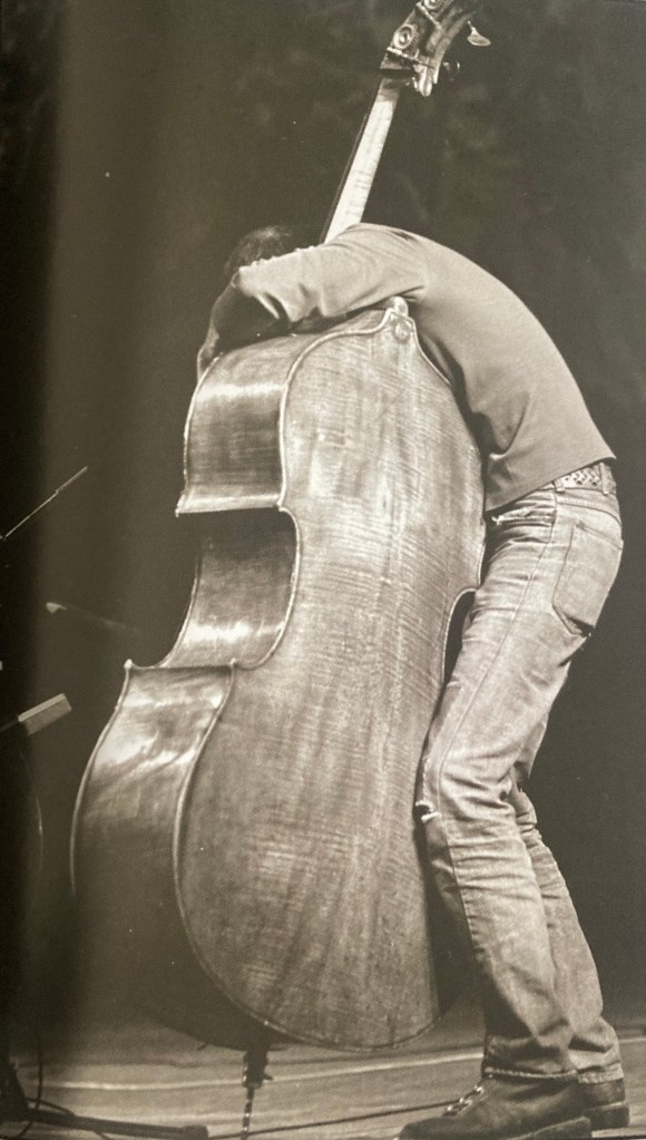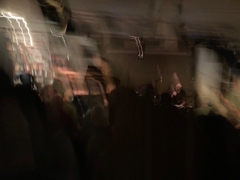 Suddenly Forbes’s concentration was abruptly broken when the bass-drum beater flew off its pedal, landing at the feet of the front row. In many decades of watching drummers, I don’t think I’ve ever seen that happen before. Anyway, the nearest member of the audience was able to lean across and hand it back to the drummer, who quickly refitted it and screwed it up tight while the other three maintained their patterns without disruption, before resuming his train of thought and taking it to a conclusion.