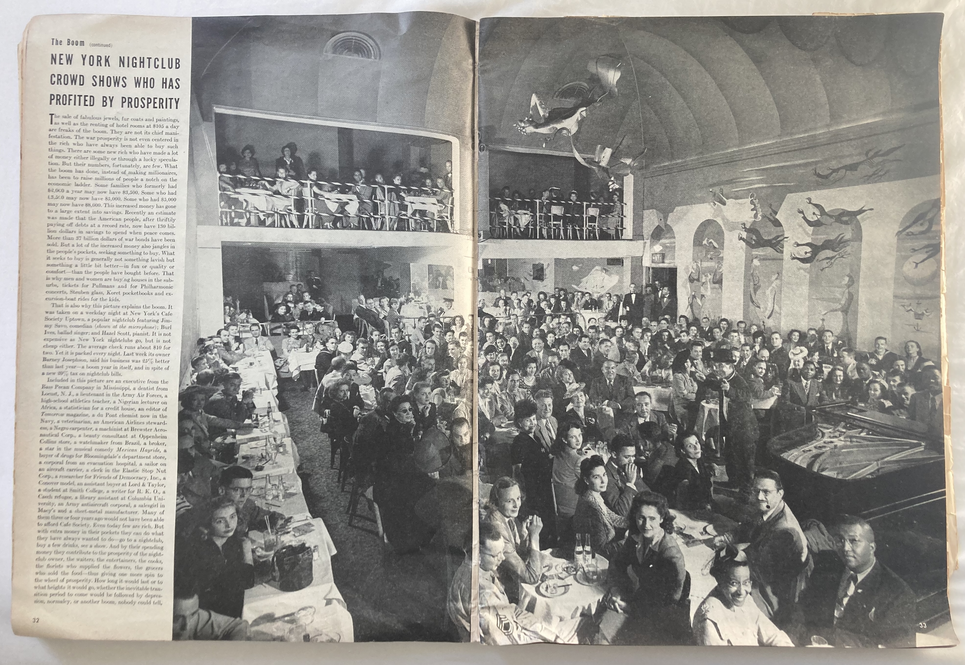 But the conclusion reached by the caption writers, pursuing the theme of a wartime boom, is this: “Many of them three or four years ago would not have been able to afford Café Society. Even today few are rich. But with extra money in their pockets they can do what they have always wanted to do — go to a night club, buy a few drinks, see a show. And by their spending money they contribute to the prosperity of the night-club owner, the waiters, the entertainers, the cooks, the florists who supplied the flowers, the grocers who sold the food — thus giving one more spin to the wheel of prosperity. How long it would last or to what heights it would go, whether the inevitable transition period to come would be followed by depression, normalcy or another boom, nobody could tell.”