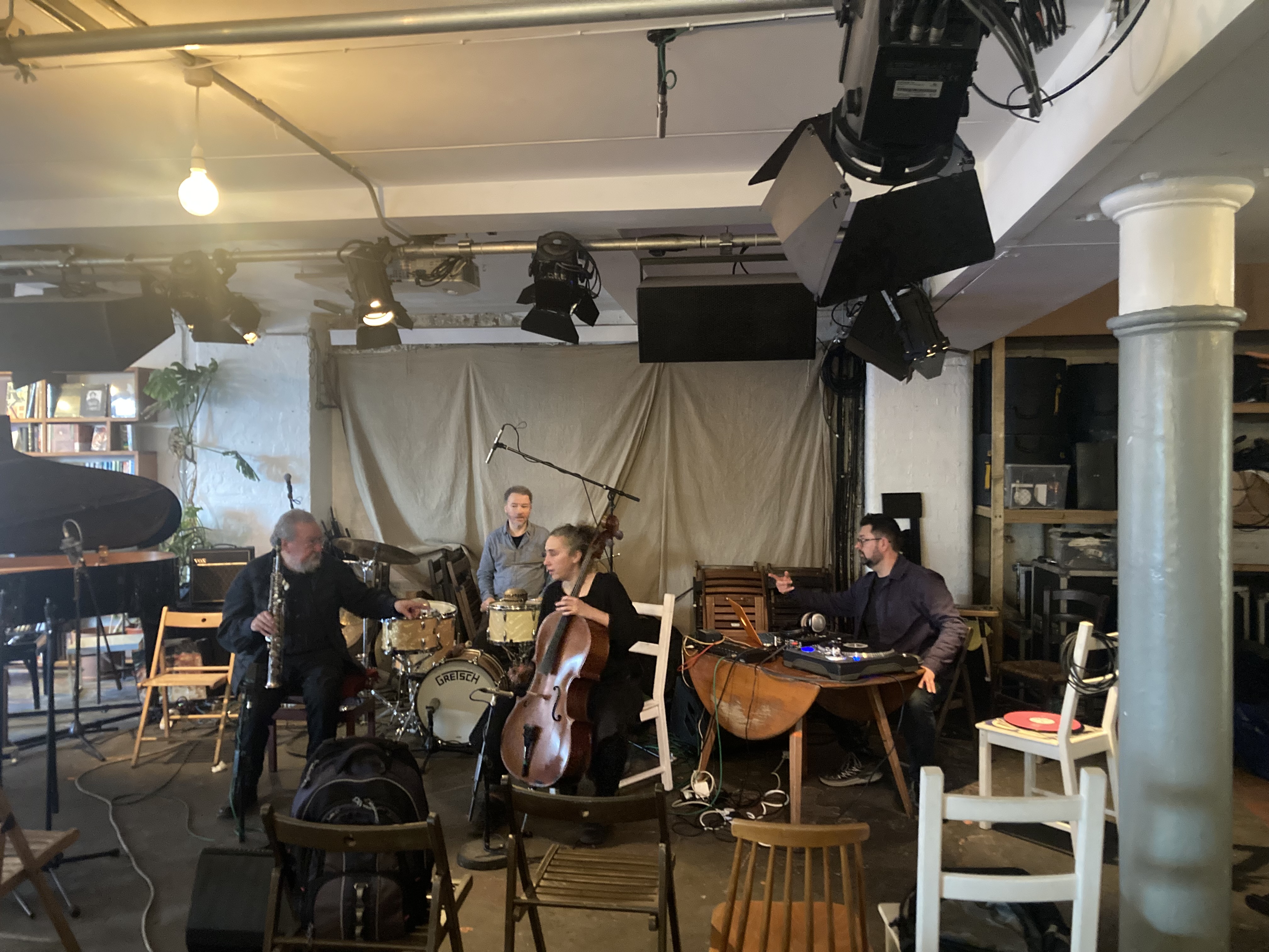 Today at Café Oto and the Vortex many of those artists performed in celebration and commemoration of Martin’s life. It was my privilege to introduce the Café Oto gig, which began with a set from the quartet pictured above during their soundcheck — Parker, Mark Sanders, Hannah Marshall and Matt Wright — and continued with the duo of the altoist Caroline Kraabel and the pianist Veryan Weston before concluding with the 27-strong London Improvisers Orchestra.